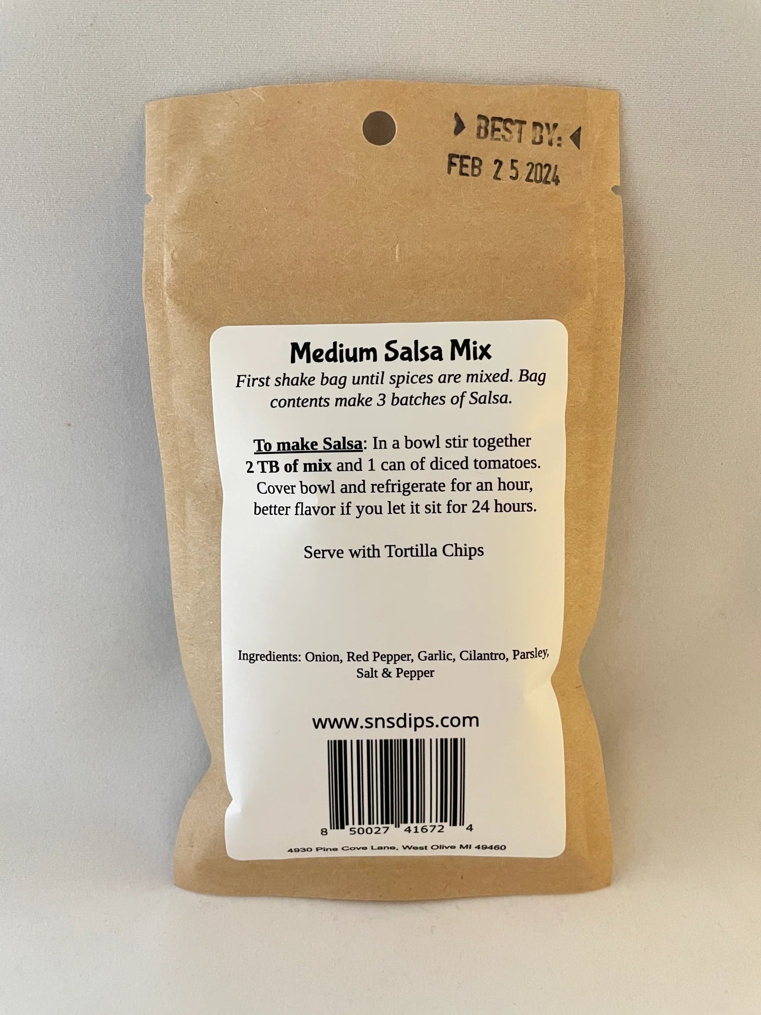 Medium Salsa Mix. Who doesn't love fresh salsa with a kick! This bag will make 3 batches of salsa. For each batch, take 2 TB of the spices and combine them with 1 can of diced tomatoes. Let it sit for at least an hour, and enjoy!