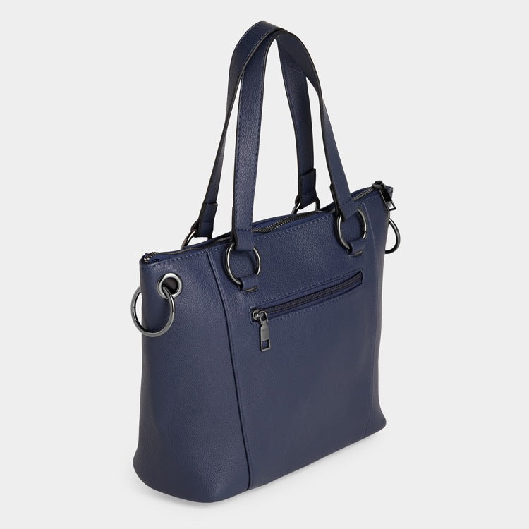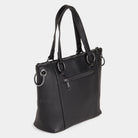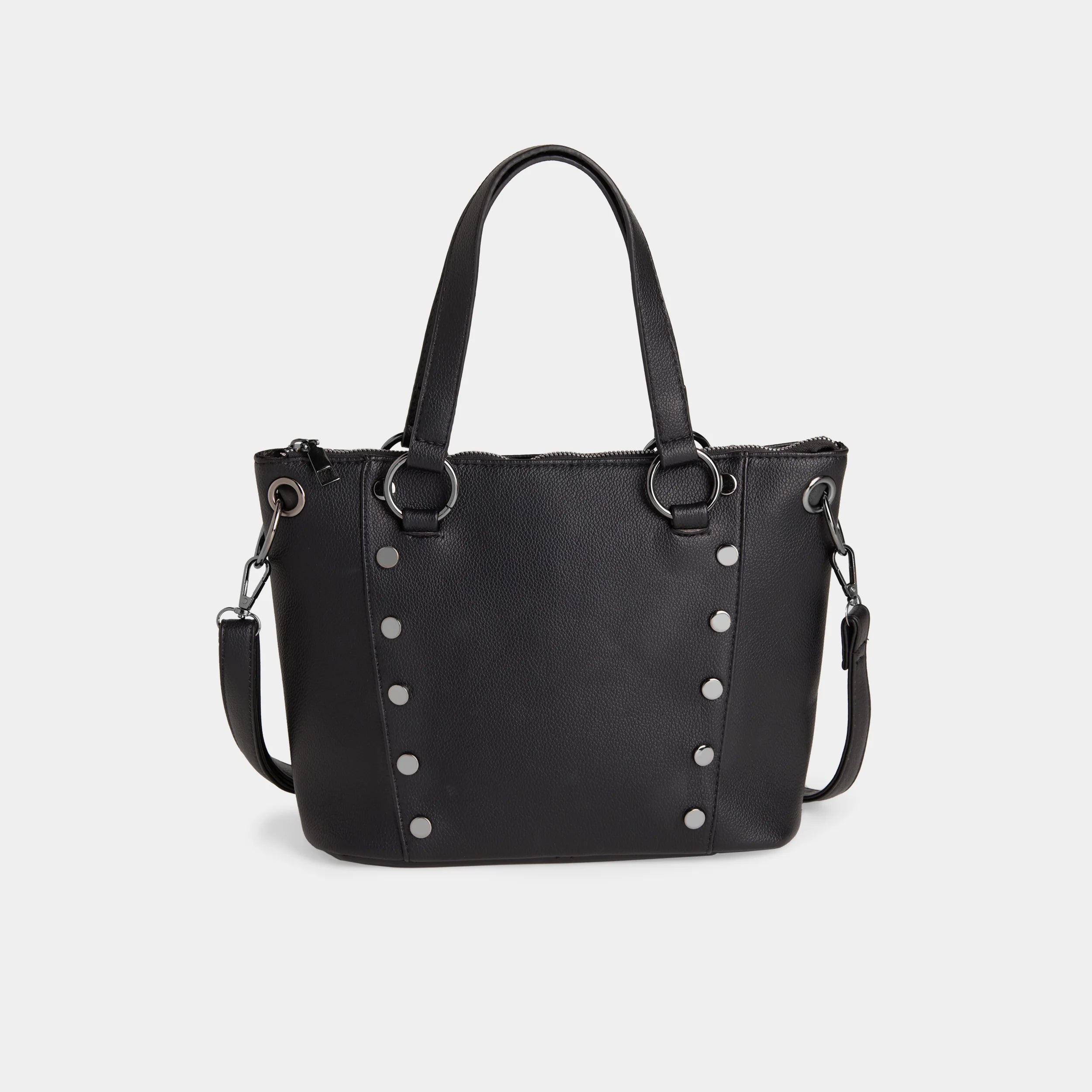 Gorgeous little fashion tote with round studs, zip-top reveals an open interior with storage compartments for essentials. Circle rings accent top handles and hold a detachable strap. This tote features a sleek design with studded detailing that adds a touch of edginess to your look. The tote is classic and timeless, making it easy to pair with any outfit. The spacious interior is perfect for carrying all of your essentials, while the sturdy handles make it easy to carry. Whether you're heading to work, running errands, or going out with friends, the Evelyn Studded Tote is the perfect accessory to complete your look.