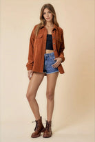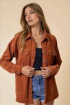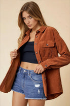 Corduroy Button Down Jacket. Stylish corduroy button down jacket. Oversized, relaxed fit for a trendy and comfortable look. Features large front pockets with button closures. Full-length button front closure with contrasting brown buttons.