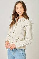 Description: Washed Denim Peplum Corduroy Jacket. Button down with frayed hem. Chest pockets. Faux bottom pockets.