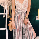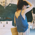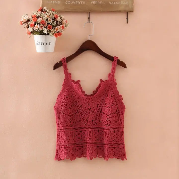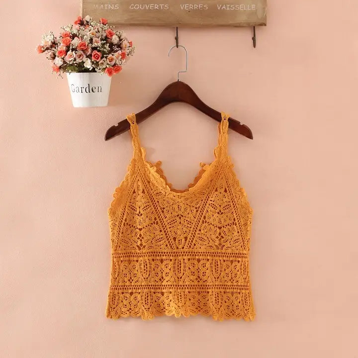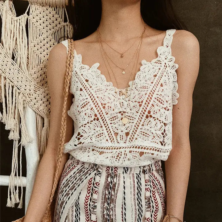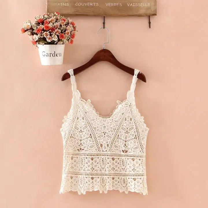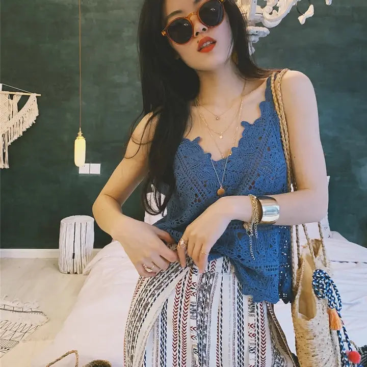 DESCRIPTION: This boho lace crochet halter top is designed with an airy, relaxed silhouette for a comfortable fit. This style is popular for festivals, beach outings, and summer wear, often paired with jeans, skirts, or shorts.