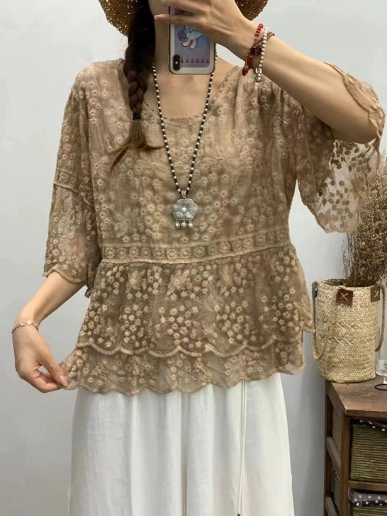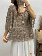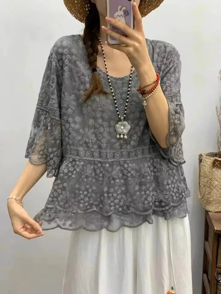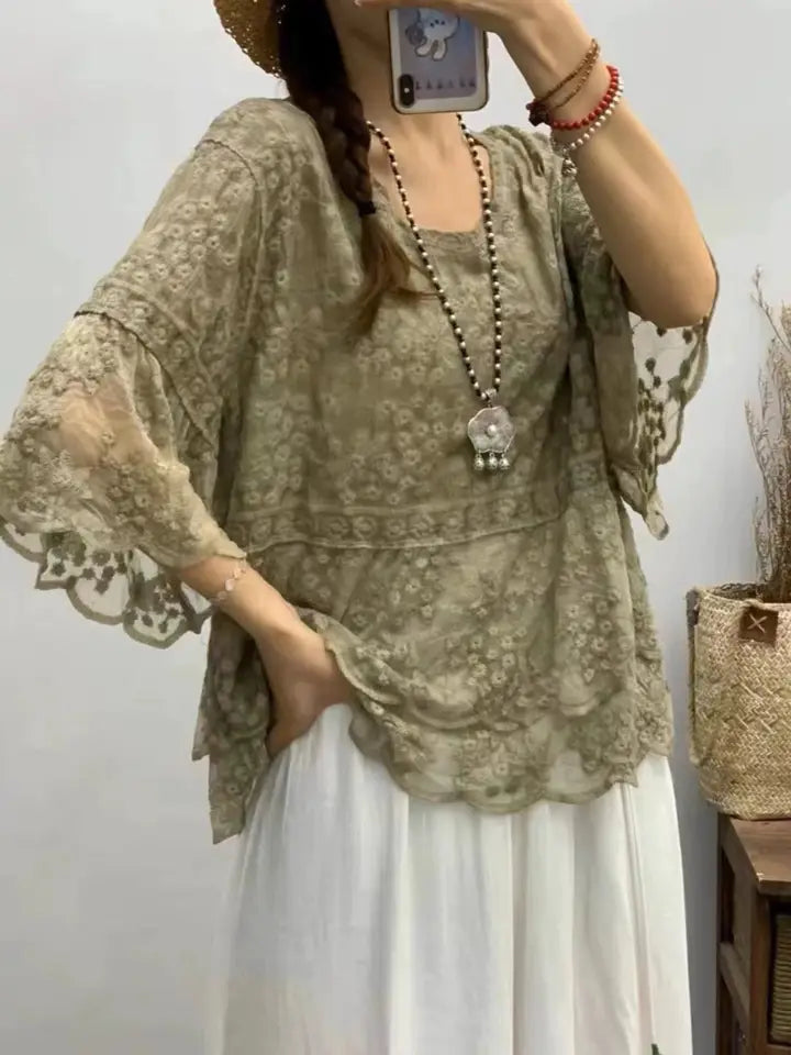 Made from soft cotton with vintage-style dyeing, this pullover top features delicate lace embroidery, loose fit, and flattering 3/4 sleeves with scalloped edges.